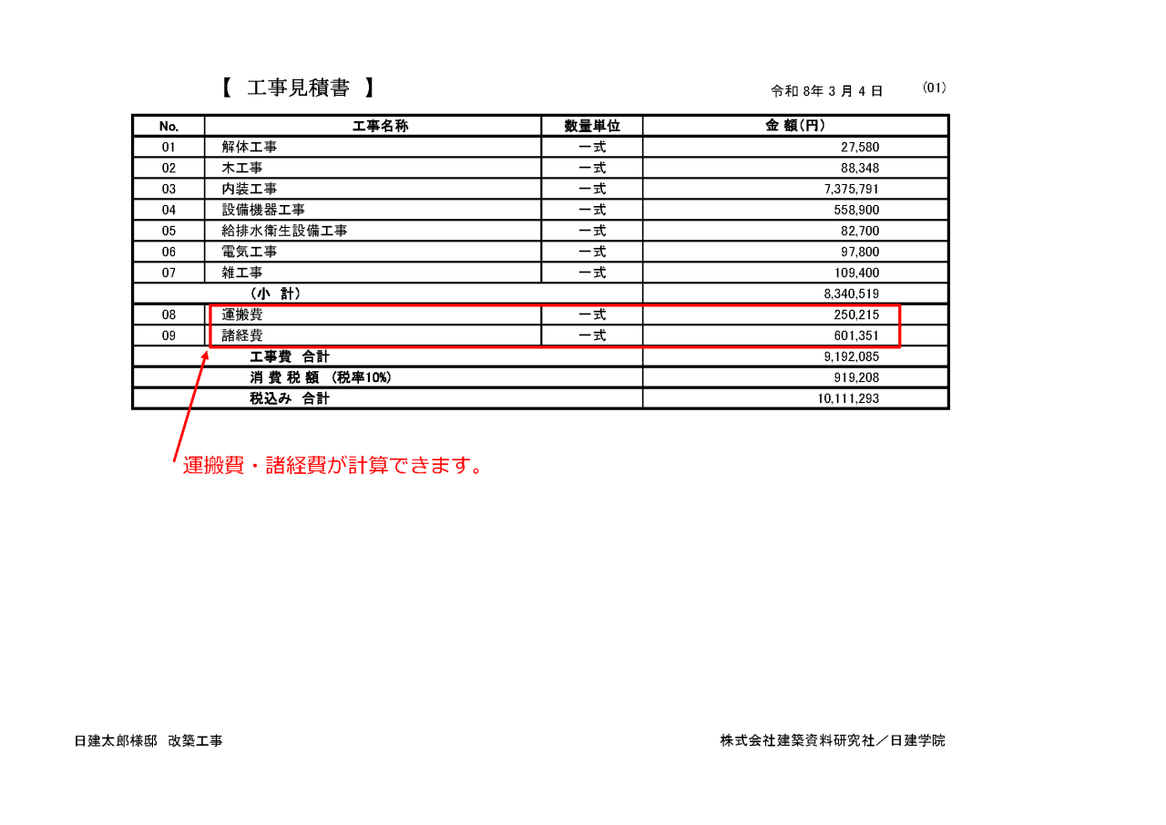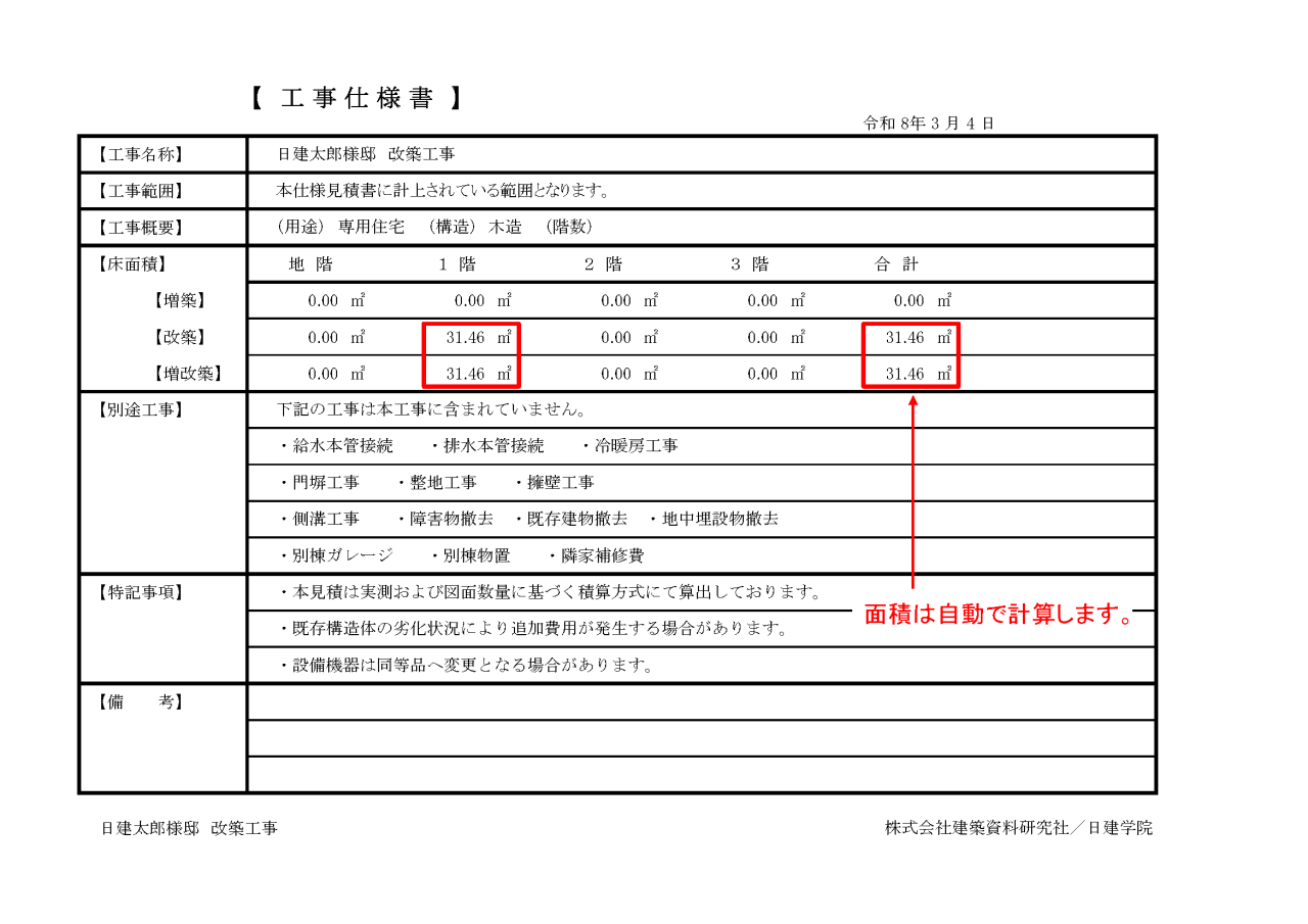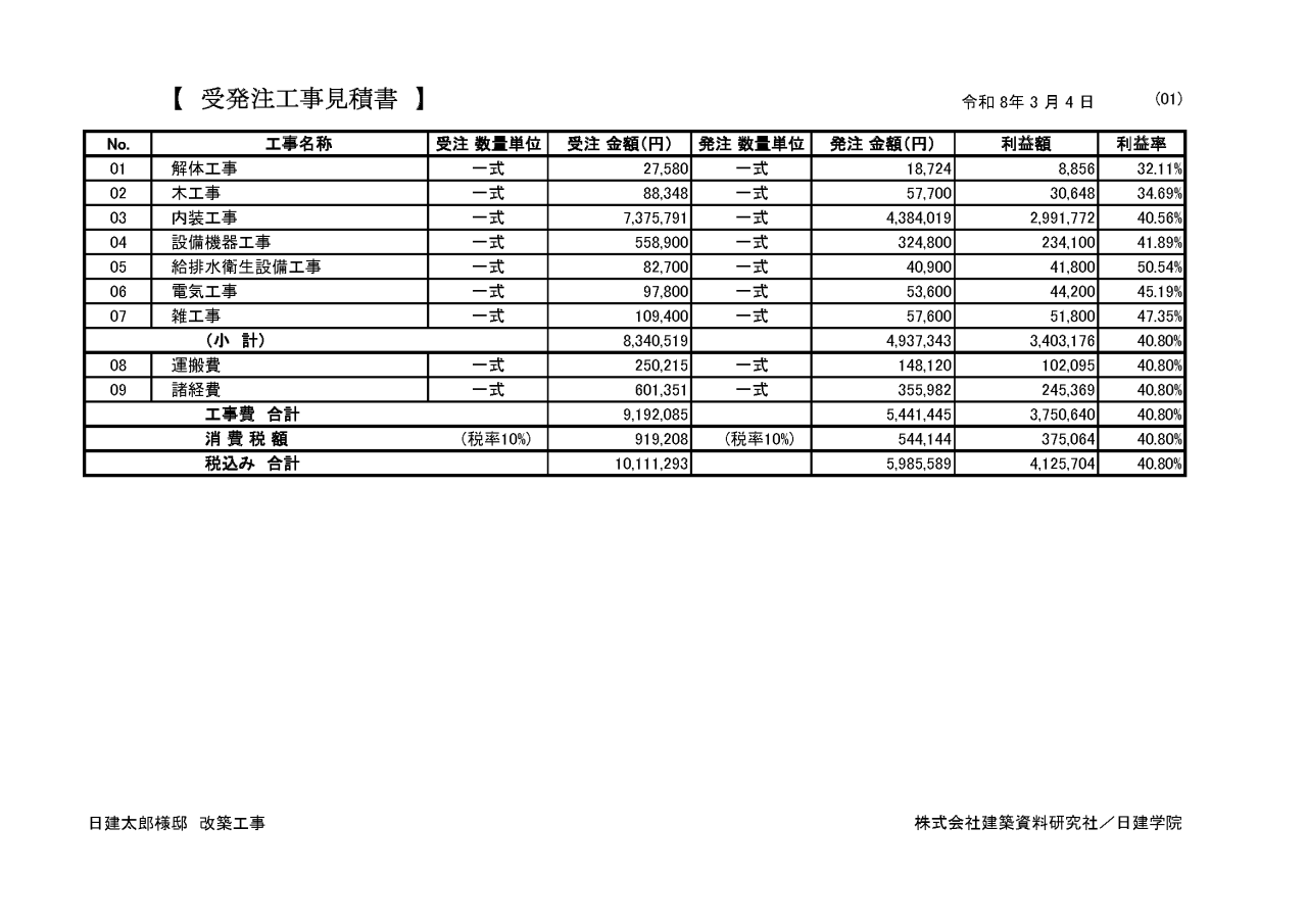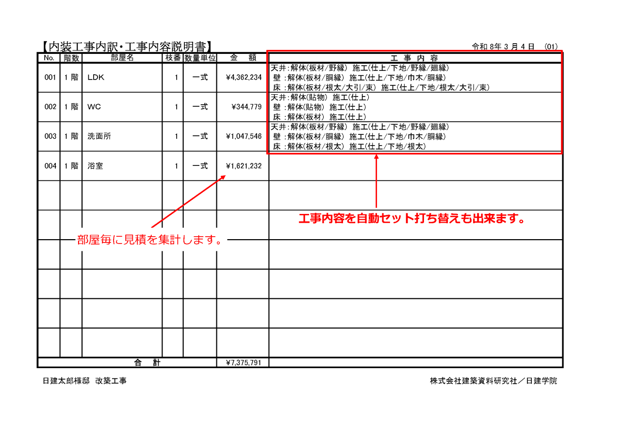 リフォーム積算プログラムの帳票サンプルをご紹介します